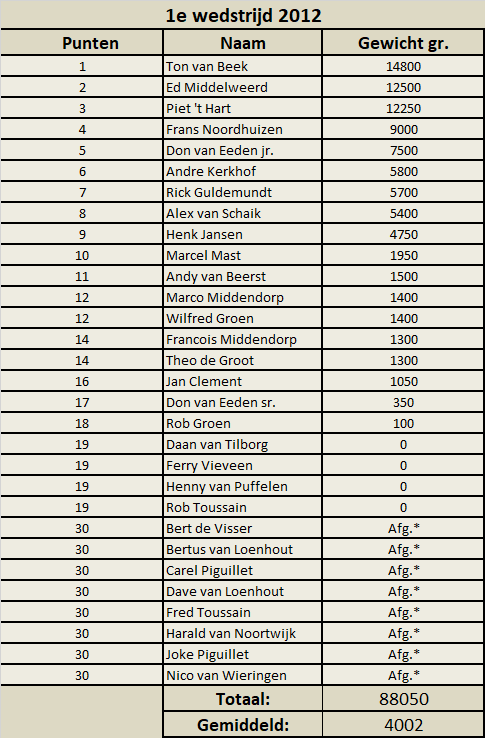 Met slechts 22 vissers werd er een prachtige totale vangst van 88 kilogram gehaald maar toch jammer dat enkele visser toch weer weinig tot niets gevangen hadden. Toch werden er eigenlijk niet echt veel vissen gevangen maar de brasems die werden gevangen waren gewoon lekker zwaar.