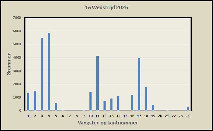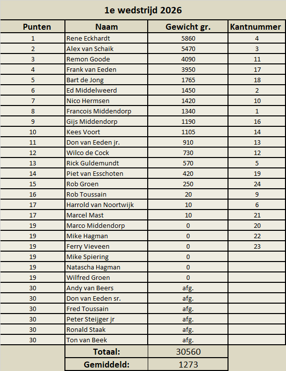 Uiteindelijk werd er met 24 vissers 30,560 kg vis gevangen maar ook met 6 vissers zonder vis. Vooral bij de linkerzijde van het parkoers en dan vooral nabij de Paprikaboer werd nog aardig gevangen.