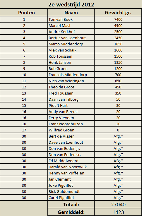 De eerste plaats met 7,4 kilogram was wederom voor onze bestuurder Ton van Beek. Met de tweede prijs van Marcel Mast met 4,9 kilogram en een derde stek voor Andre Kerkhof met 2,5 kilogram.