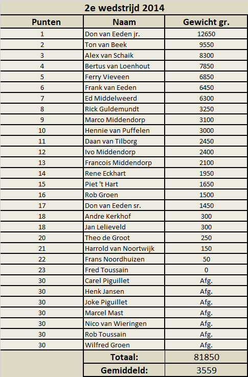 Toch was alle moeite niet vergeefs, met de 22 vissers vingen we mooi toch nog 81.850 kg vis en dan vooral dikke vette Brasems. Ter vergelijking, vorig jaar visten we met 26 vissers met 53.825 kg toch beduidend minder. Het dag-podium bestond vandaag uit Alex op de 3e plek met 8,3 kg, 2e plek voor Ton met 9.55 kg en glorieus dagwinnaar werd Don jr. met een mooi 12.650 kg. Heren gefeliciteerd!