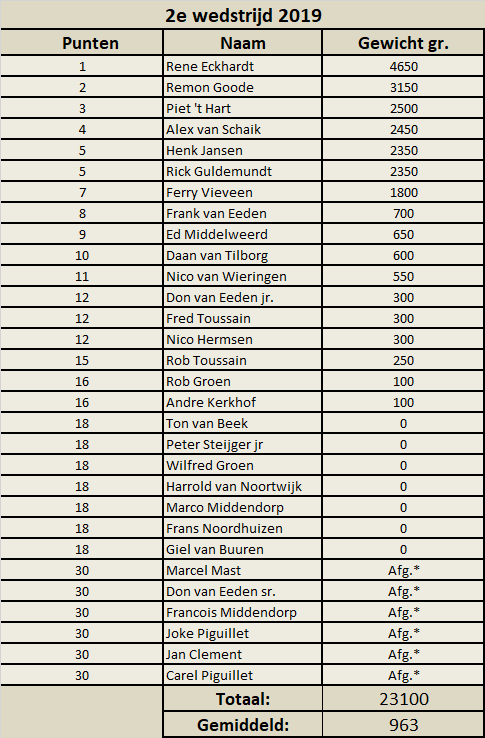 Deze wedstrijd kende uiteindelijk een podium met een 3e plaats voor Piet ’t Hart met 2,5 kg, een 2e plek voor Remon Goode met 3,150 kg en als winnaar kwam vandaag René Eckhardt met 4,6550 kg uit de bus. Heren proficiat.