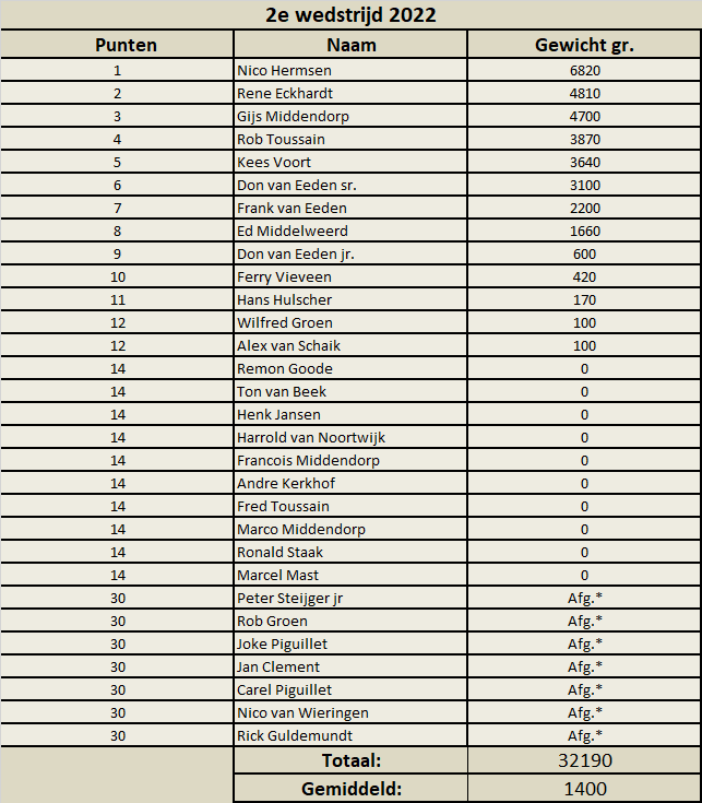 Maar zoals altijd hadden we gelukkig toch weer een podium en dat werd deze dag met 4,7 kg onze Gijs Middendorp met de derde plaats. De tweede plaats was voor René Eckhardt met 4,810 kg en de dagwinnaar werd Nico Hermsen met 6,820 kg. Proficiat mannen.