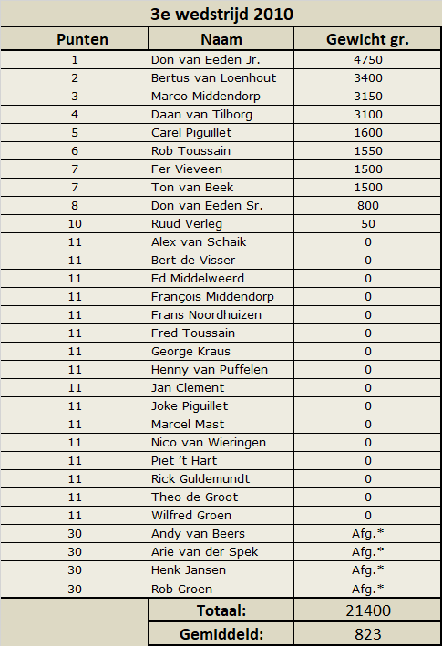 Eindelijk bleek tijdens de pauze dat Don van Eeden jr. mogelijk te kloppen was want hij had nog helemaal niets. Verbijsterd waren we dan ook dat hij na 11:15 uur (toen zijn buurman Carel eerder weg moest) toch nog drie brasems gevangen had en toch weer 1e werd met 4750 gram. Don gefeliciteerd met je overwinning!