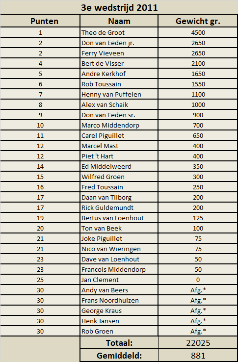 Voor degene die een goede paraplu had ging het vissen verder wel aardig al vielen de vangsten wederom tegen. Het wil dit jaar nog niet echt lukken. De winnaar werd uiteindelijk Theo de Groot die in enkele minuten ineens een paar prachtige brasems voorbij zag komen waardoor hij ineens met 4,5 kilo een net netje vis kon laten wegen. Hartstikke gefeliciteerd Theo. Het podium werd gecompleteerd door Ferry Vieveen en Don van Eeden jr. die beiden 2,65 kilo vis hadden.