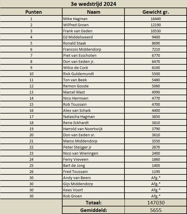 Het podium bestond vandaag met een 3e plaats met 10.530 kg voor Frank van Eeden, een 2e plaats met 12.190 kg voor onze vaste stokker Wilfred Groen en afgetekend 1e met 16.440 kg werd Mike Hagman de dagwinnaar. Proficiat mannen!