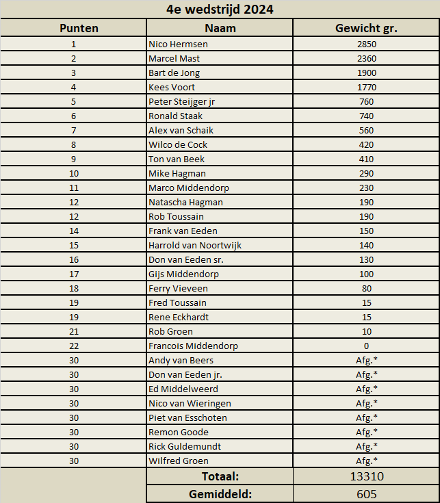 Het podium was vandaag dus voor degene die wel net die brasem kon landen. De 3 prijs was voor onze “palingboer” Kees Voort – hij had weer 3 palingen gevangen waaronder een hele flinke – met een vangst zonder palingen van 1.770 kg. De 2e plaats was voor Marcel Mast met 2.360 kg en 1e met 2.850 kg Nico Hermsen. Mannen proficiat.
