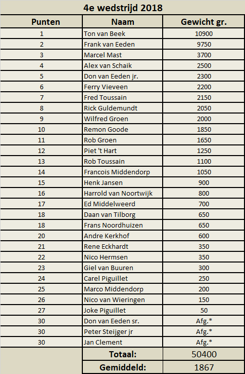 De 3e plaats was vandaag voor Marcel Mast met 3,7 kg, een verdienstelijke 2e plaats was er voor Frank van Eeden met 9,750 maar de 1e plaats was voor Ton Verbeek met een mooi net brasems en 10,9 kg. Heren proficiat.
