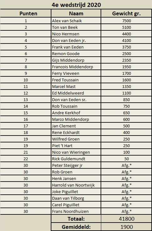 Al met al was de vangst van bijna 42 kg met 22 vissers redelijk maar dit water kan toch echt nog betere vangsten geven. Het podium was deze wedstrijd met een 3e plaats voor Nico Hermsen met 4,4 kg, een 2e plaats met 5,1 kg voor Ton van Beek, die op de linker kopplek zat en afgetekend 1e Alex van Schaik met 7,5 kg die op de rechter kopplek zat. Proficiat mannen!