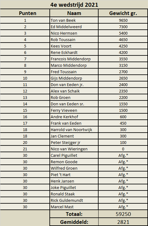 Ons podium bestond deze visdag met een 3e plaats voor Ferry Vieveen met 7,4 kg, een 2e plaats voor Marcel Mast met 10,450 kg en winnaar werd Nico Hermsen met 13 kg. Gefeliciteerd mannen.