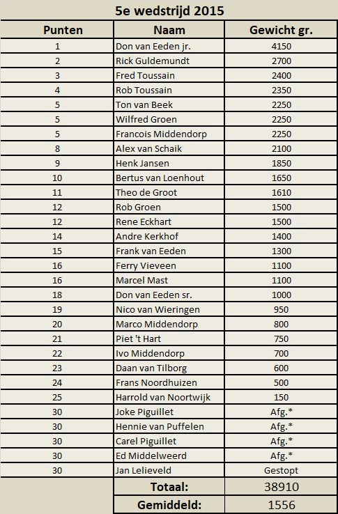 Al met al werd er deze dag toch bijna 39 kilogram vis gevangen en iedereen had in ieder geval een visje. Don jr. had wederom weer de juiste tactiek voor het kleine spul en had een grote hoeveelheid visjes; maar liefs 4,150 kg en werd hiermee afgetekend dagwinnaar. De tweede plek met 2,7 kg was voor Rick en de 3e plek voor Fred met 2,4 kg en zo hadden we weer een mooi dagpodium.