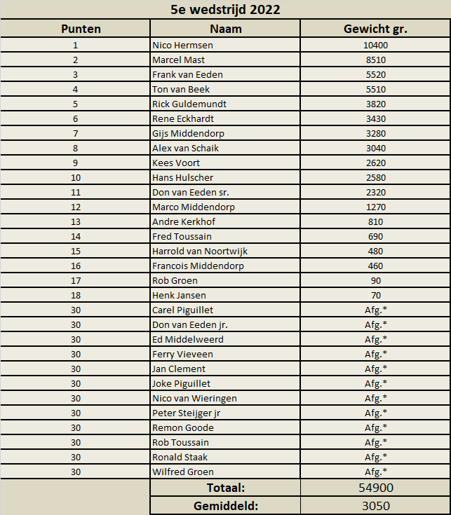 Het podium van deze visdag werd gevuld door Frank van Eeden op plek 3 met 5,520 kg, een 2e plek voor Marcel Mast met 8,510 en ruim 1e met ondermeer twee mooie giebels en 10,400 kg Nico Hermsen. Proficiat heren!