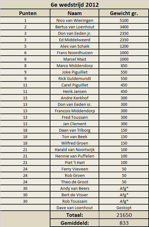 Er was eigenlijk maar één uitzondering op deze droefenis en dat was Nico van Wieringen. Met zijn radio aan op de eindstek vissend met links en rechts van hem bomen en bosschages, kon hij een mooi aantal brasems naar binnen halen. Nico werd dan ook met ruim 5 kg vis de terechte winnaar. Het podium werd verder gevuld met Bertus van Loenhout met 3,4 kg en op een gedeelde derde plaats Don van Eeden jr. en Ed Middelweerd met beiden 2,35 kg. Heren van harte!