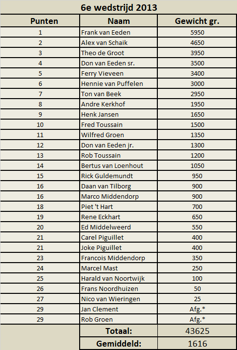 Zoals vaak in dit water waren vooral weer de beide uiteinden en kopplekken van onze wedstrijd de plekken to be. Met bijna 44 kilogram werd er aardig gevangen en met respectievelijk Frank van Eeden met 5,950 kg, Alex van Schaik met 4,650 kg en Theo de Groot 3,950 kg hadden we een prima top 3 voor deze wedstrijd.