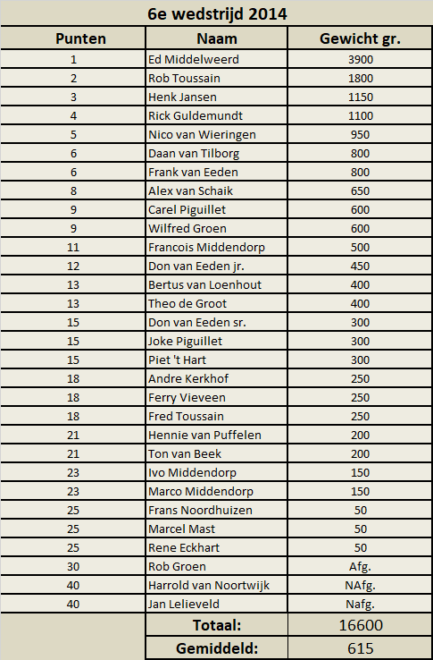 Deze hele dag is er nauwelijks brasem gevangen, de enige echte uitzondering was eigenlijk de dagwinnaar Ed Middelweerd die met 3,9 kg nog een aardige vangst had, zeker afgezet tegen alle andere vissers. Zoals te doen gebruikelijk was er natuurlijk een vol podium en met Rob Toussain met 1,8 kg en Henk Jansen met 1,15 kg werd het podium ondanks alles toch gewoon weer gevuld. Heren proficiat!