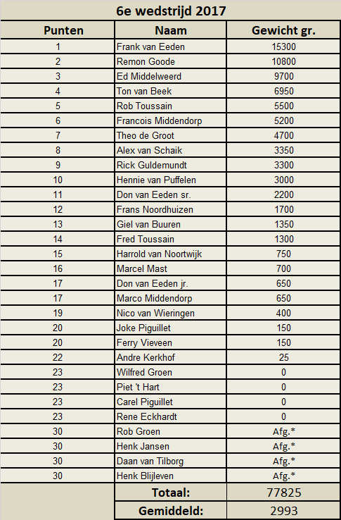 Het podium van deze wedstrijd werd gevormd met een 3e plaats voor Ed Middelweerd met 9,7 kg, een 2e plaats voor Raymond Goode met 10,8 kg en afgetekend 1e werd Frank van Eeden met 15, 3 kg. Een prachtige resultaat heren, proficiat.