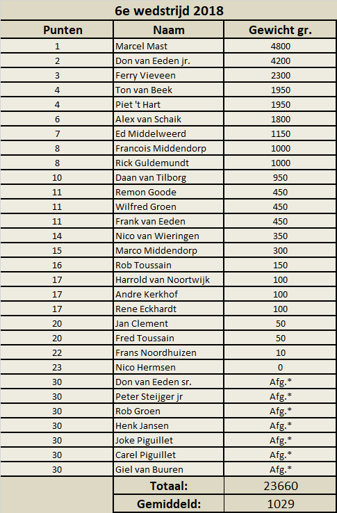 Was het vorig jaar toch vooral aan de linke zijde van het parcours, vandaag waren de beste plekken toch rechts van de brug. De 3e plaats was vandaag voor Ferry Vieveen die zijn kopplek goed uitbuitte met 2,3 kg, de 2e plaats was voor onze Grote Kampioen Don van Eeden jr. die een gevarieerde vangst had op de feeder en vaste stok met 4,2 kg maar dagwinnaar werd Marcel Mast met een aardig net brasems en 4,8 kg. Proficiat heren.