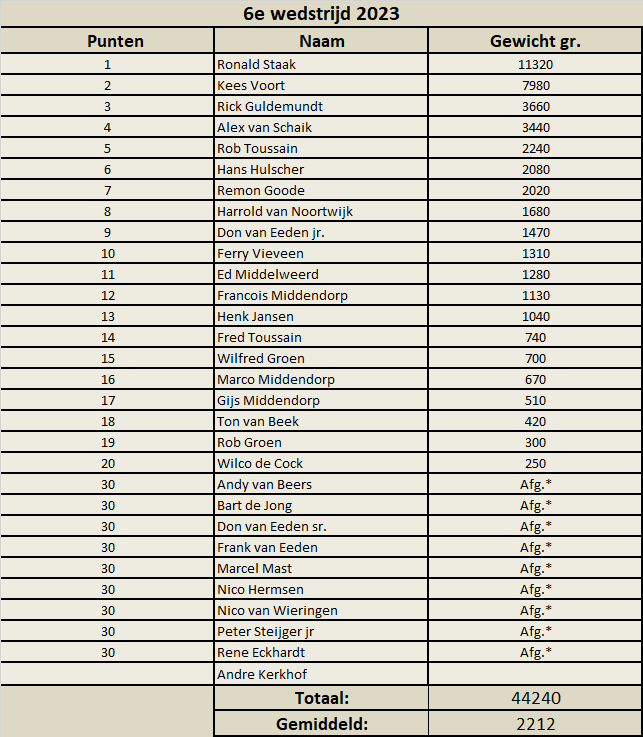 Maar ondanks dit werd er toch nog redelijk gevangen al was het vooral op enkele verwachtte plekken zoals de linker kopplek. Uiteindelijk werd er ruim 44 kilo gevangen en bestond het podium deze visdag uit een 3e plaats voor Rick Guldemundt met 3,660 kg, een 2e plek voor Kees Voort met 7,980 kg en afgetekend 1e werd Ronald Staak met 11,320 kg. Proficiat mannen!