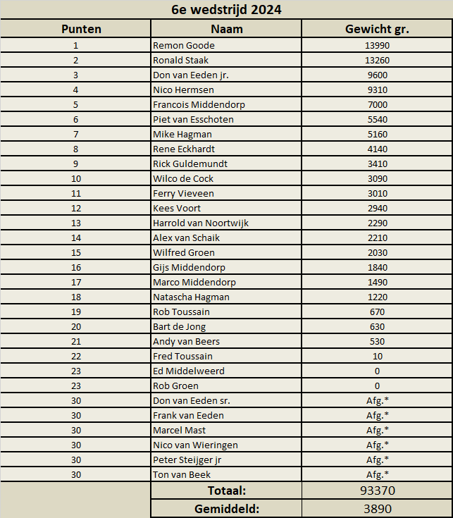 Helaas leek dit alles toch invloed te hebben gehad op de vangsten van dit topwater. Vooral de rechterzijde van het parkoers had mooie vangsten maar de door verschillende leden meegenomen extra leefnetten waren vandaag toch echt niet nodig. Verder waren er diverse stekken waar de vis gewoon niet aanwezig was of niet wilde bijten. De uiteindelijk met 24 vissers gevangen 93.370 kg is natuurlijk mooi maar viel voor dit viswater toch tegen.