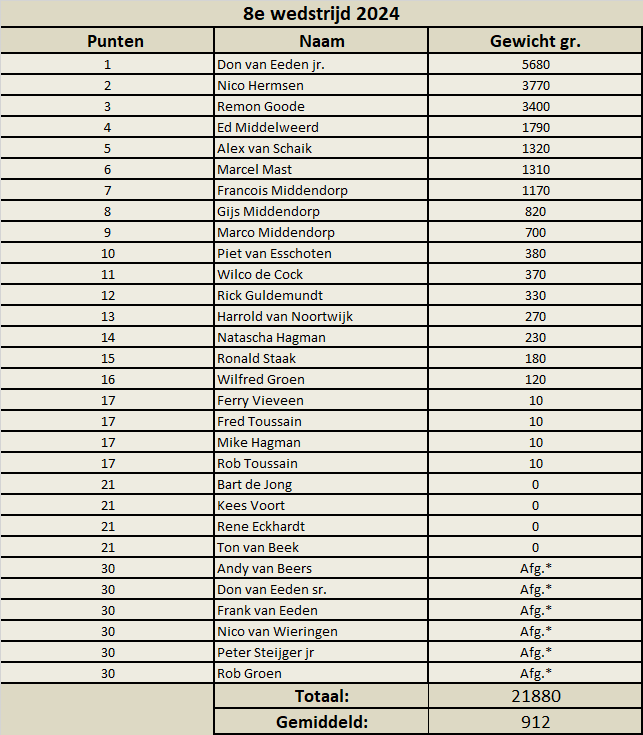 Dit onstuimige weer leek toch ook de vangsten te beïnvloeden. Het was op sommige momenten erg tam op bijna het gehele parkoers. Dit was echt zo’n dag dat één brasem veel verschil kon maken. Helaas was het ook een dag dat er acht visser geen of nauwelijks vis vingen. Totaal werd er met 24 vissers slechts 21.880 kg vis gevangen, erg matig voor dit mooie water.