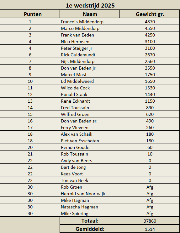 Uiteindelijk werd er met 25 vissers toch 37.860 kilo vis gevangen waaronder enkele mooie brasems. Verder waren de vangsten redelijk over het parkoers verdeelt maar beide kopstekken hadden vandaag zoals vaker de beste plekken. De 3e plaats was voor Frank van Eeden met 4.250 kg, 2e werd uw secretaris met 4.550 kg en 1e werd François Middendorp met 4.870 kg vis. Proficiat met deze mooie uitslag.