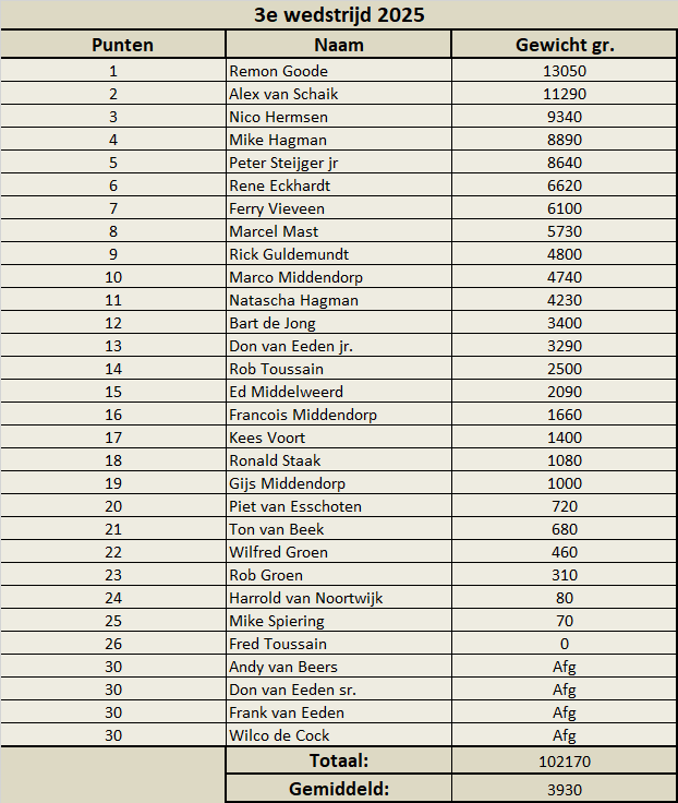 Om vandaag te winnen had je aardig wat gewicht nodig. 3e werd Nico Hermsen met 9.340 kg, 2e werd Alex van Schaik met 11.290 en voor de tweede keer in successie, Remon Goode werd 1e met 13.050 kg. Proficiat mannen.