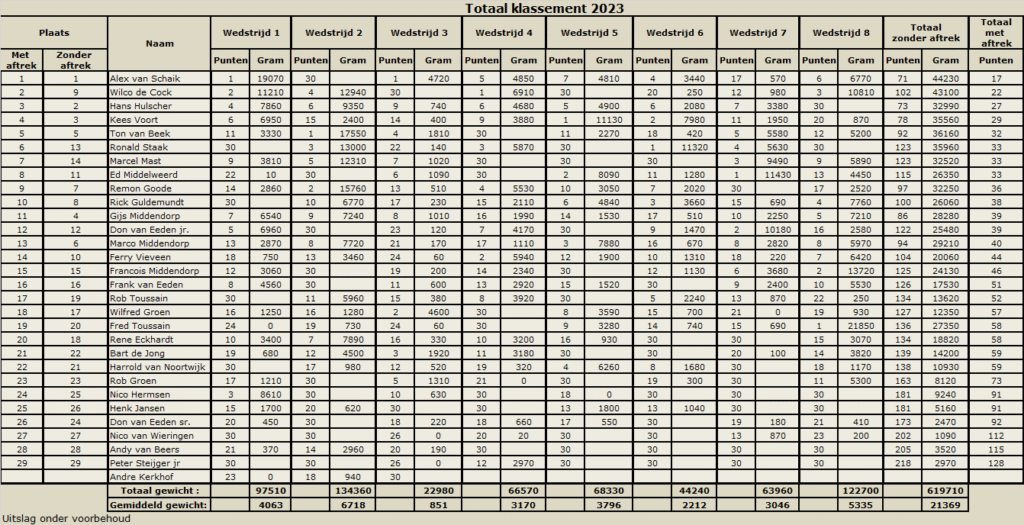 Het seizoen podium werd dit jaar verder gevormd door Wilco de Cock op de 2e plaats en Hans Hulscher op de 3e plaats. Goed gedaan mannen en de door Karsdorp Sloopwerken gesponsorde bekers werden aan hen uitgereikt. Verder is het vermelden waard dat we dit seizoen prima vangsten hadden, we vingen in totaal maar liefs bijna 500 kg vis, volgens mij een record!